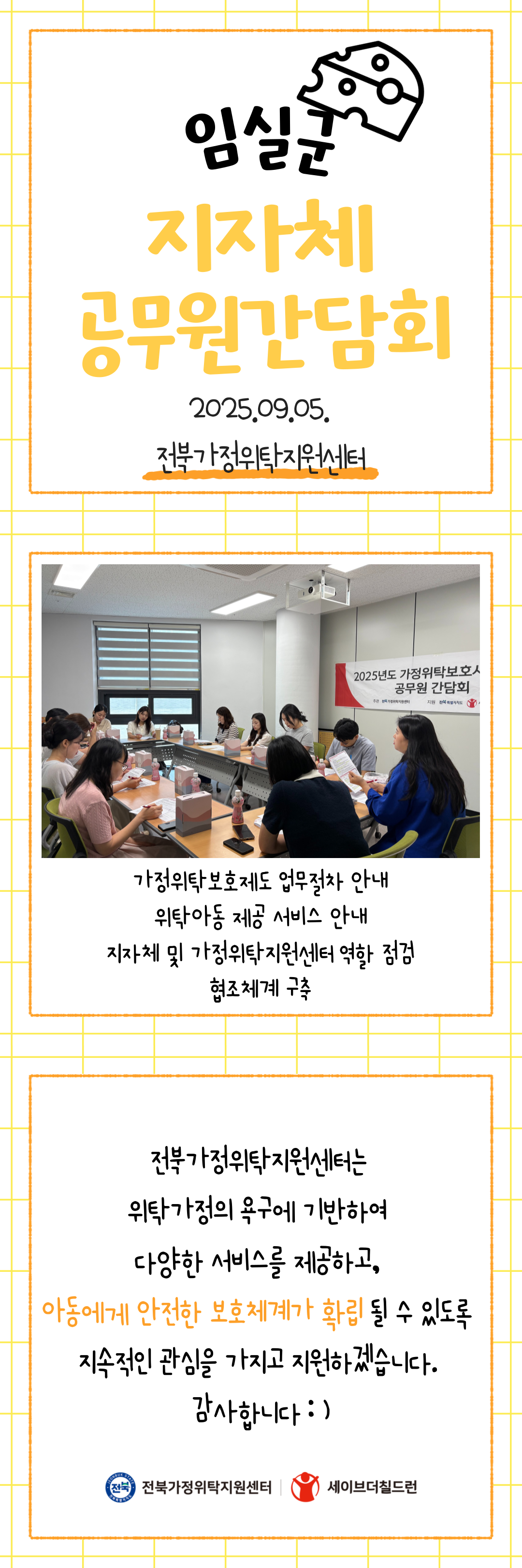 ¾È³çÇϼ¼¿ä. ÀüºÏ°¡Á¤À§Å¹Áö¿ø¼¾ÅÍÀÔ´Ï´Ù :) Áö³ 9¿ù 5ÀÏ, ÀӽDZº ÁöÀÚü °ø¹«¿ø°£´ãȸ¸¦ ÁøÇàÇÏ¿´½À´Ï´Ù. *°£´ãȸ ³»¿ë* °¡Á¤À§Å¹º¸È£Á¦µµ ¾÷¹«ÀýÂ÷ ¾È³» À§Å¹¾Æµ¿ Á¦°ø ¼ºñ½º ¾È³» ÁöÀÚü ¹× °¡Á¤À§Å¹Áö¿ø¼¾ÅÍ ¿ªÇÒ Á¡°Ë ÇùÁ¶Ã¼°è ±¸Ãà °£´ãȸ¸¦ ÅëÇØ °¡Á¤À§Å¹º¸È£Á¦µµ ¹× º¸È£ÀýÂ÷, ¼ºñ½º¿¡ ´ëÇÑ ÀÌÇØ¸¦ ³ôÀ̰í ÁöÀÚüº° È¿À²ÀûÀÎ ¾÷¹«Ã³¸®¸¦ À§ÇÑ Çù·Âü°è¸¦ ±¸ÃàÇÏ´Â ½Ã°£À» °¡Á³½À´Ï´Ù.